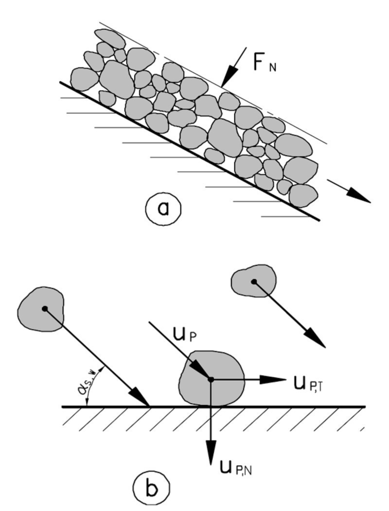 Beim Strahlverschleiß (Bild 1b) prallen Schüttgutpartikeln unter dem gegen die Wandoberfläche gemessenen Winkel aS,W auf den Grundkörper. Der Einzelpartikelaufprall kann somit in eine wandnormale und eine wandparallele Komponente zerlegt werden. Die bei der wandparallelen Bewegung möglichen Verschleißmechanismen entsprechen weitestgehend denjenigen des Abrasivverschleißes. Ein Unterschied besteht darin, dass die Anpresskraft gegen die Wand in dieser Phase nicht definiert bzw. nur gering ist und sich während des Kontakts ändert. Durch die wandnormale Komponente werden die Verschleißmechanismen Mikroermüden und Mikrobrechen wirksam. Wandnormale und -parallele Wirkungen überlagern sich.