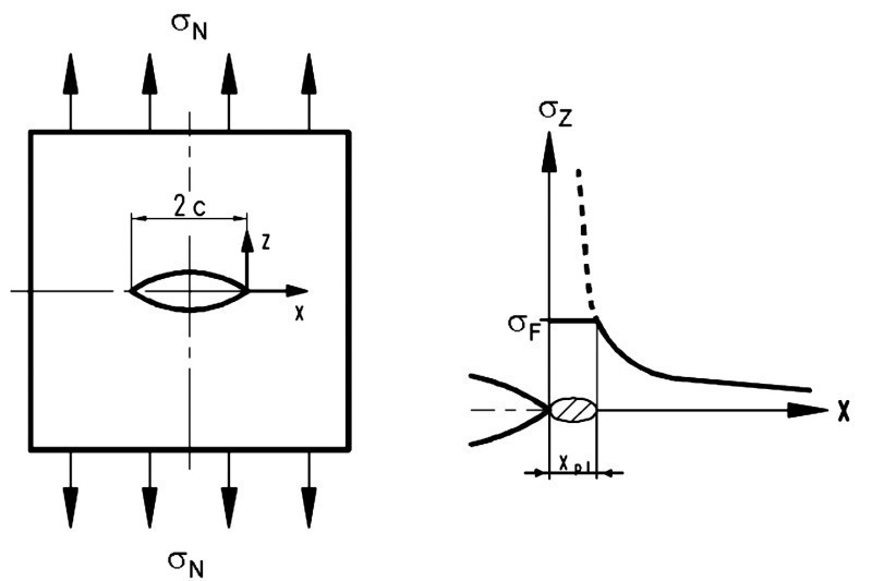 Aus einer Energiebilanz an einem Riss der Länge 2c folgt, dass die für eine Rissvergrößerung von 2c auf (2c + dc) (= Erzeugung einer größeren Rissoberfläche) erforderliche spezifische Energiefreisetzungsrate dW/dc  =  K2I/EW einen kritischen Wert KIc überschreiten muss. Hieraus folgt: Erst wenn der Spannungsintensitätsfaktor KI eine werkstoffspezifische kritische Größe KIc, die sogenannte Bruchzähigkeit, erreicht, kommt es zum Risswachstum. Wie Gl. (6) zeigt, sind großen KIc-Werten große plastifizierte Bereiche vor der Rissfront zugeordnet und umgekehrt. Ein duktiler Werkstoff ist deshalb zäher/weniger bruchempfindlich als ein spröder Werkstoff, weil er mehr Energie irreversibel durch Aufbau der plastischen Zone absorbiert, die dann nicht mehr für eine Oberflächenvergrößerung des Risses zur Verfügung steht [3, 10].