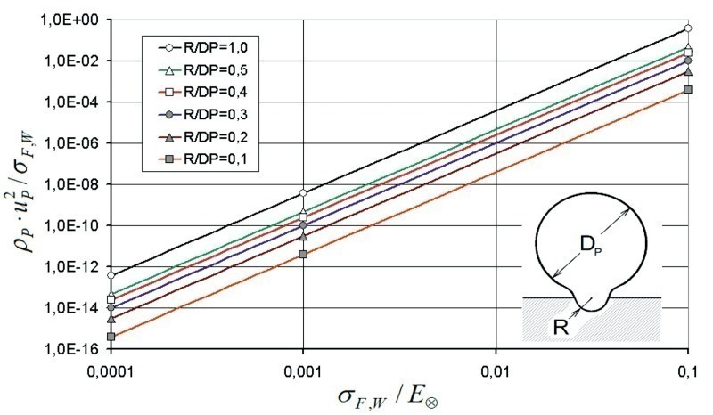 In der Anwendung bedeutet das folgendes: Eine ­Stahlkugel prallt senkrecht auf eine ebene Stahlwand, sF,W  =  1000 MPa, EW  =  EP  =  210 GPa, nW  =  nP  =  0,3, DP  =  1,0 mm, R/DP  =  0,5, rP  =  7850  kg/m3, daraus uP,F = 0,146 m/s . Wird die Stahlkugel