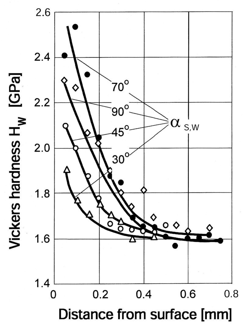 zeigt derartige durch intensiven Partikelbeschuss verursachte Härteprofile in einem Grundkörper aus C-Stahl [7]. Parameter ist der Aufprallwinkel aS,W. Die Vickershärte des unbeanspruchten Stahls beträgt hier HW  >  1,60 kN/mm2. Beim bisher vorausgesetzten linear elastisch-ideal plastischen Verhalten gilt sF,W  =  konst. Zusätzlich kann auch die Beanspruchungsgeschwindigkeit das Werkstoffverhalten beeinflussen.