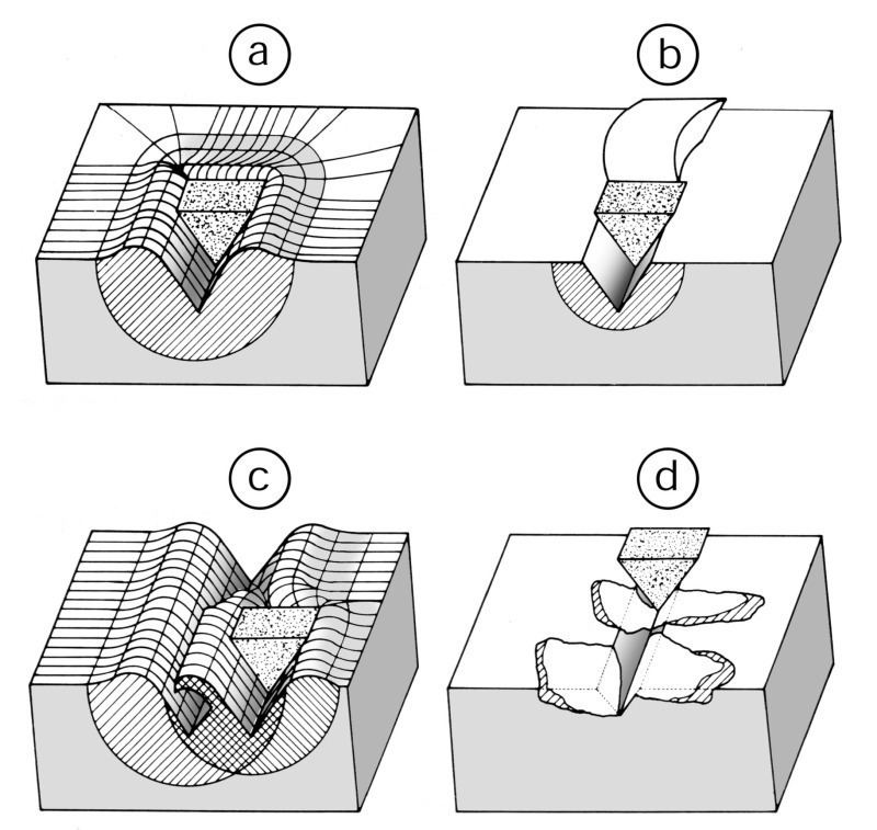 Ist Gl. (4) erfüllt, d.  h. sind die Schüttgutpartikeln ausreichend hart und auch in der Lage, die oben diskutierten Kontaktbelastungen zerstörungsfrei zu ertragen, so resultiert das in einer intensiven Beanspruchung des Grundkörpers und es muss mit hohem Verschleiß an diesem gerechnet werden. Das Ablösen einer Verschleißpartikel ist gleichbedeutend mit einem lokalen Bruch des Grundkörperwerkstoffs. Brüche werden durch Zugspannungen (Bruchform: Sprödbruch) oder Schubspannungen (Bruchform: Zähbruch) verursacht. Mischformen treten ebenfalls auf. Vorstufe eines Bruchs ist der Anriss, dessen Vergrößerung zum Bruch führen kann. Man unterscheidet stabiles Risswachstum von instabilem Risswachstum. Im erstgenannten Fall erweitert sich der Riss nur bei weiter ansteigender Belastung, im zweiten vergrößert er sich ohne eine weitere Lasterhöhung unter Nutzung von im Grundkörper gespeicherter elastischer Energie.