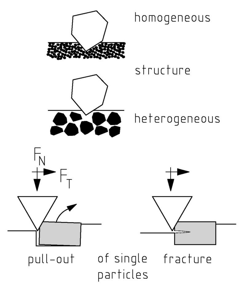 Beim Einsatz sehr heterogener Grundkörperwerkstoffe, z.  B. von Materialien aufgebaut aus einer harten grobkristallinen Phase I verteilt in einer homogenen Phase II oder einem partikelförmigen Härteträger eingelagert in einer weicheren Matrix, können weitere Verschleißmechanismen beobachtet werden. Bild 11 zeigt schematisch das beim Abrasivverschleiß mögliche Herauslösen oder Abscheren einzelner Partikeln der grobkörnigen Phase. Ähnliches ist auch beim Strahlverschleiß möglich: Wiederholter Partikelaufprall führt zu einer Zerrüttung der Grundmatrix und der Bindung zwischen Matrix und Grobkorn derart, dass einzelne Partikeln der groben Phase als Ganzes herausgelöst werden. Diese Vorgänge werden u.  a. vom Verhältnis der Teilchengröße der Grobphase zur Größe des Eindringvolumens der Schüttgutpartikeln, dem Teilchenabstand bzw. dem Volumenanteil der Grobphase im Grundkörperwerkstoff, der Bindung der Phasen untereinander sowie von der Intensität der Beanspruchung beeinflusst.