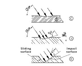 Der Wert des Exponenten n ist in geringem Maße vom Anstrahlwinkel aS,W abhängig. Für praktische Belange kann diese Abhängigkeit vernachlässigt werden. Messungen in [23] deuten darauf hin, dass n offensichtlich auch von der Stoßdichte n˙P = N˙P/A, mit: N˙P = Partikelstrom, A = Aufprall­fläche ( siehe unten), beeinflusst wird: Der an einem Stahl St 52 in einer aufgelockerten Schüttgutmasse der Dichte rb ù 0,57 · Schüttdichte rSS ermittelte Geschwindigkeitsexponent liegt mit n = 1,35 deutlich niedriger als der aus normalen Blasversuchen. Andere Wandwerkstoffe zeigen vergleichbare Abweichungen.
