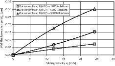 – Gleitgeschwindigkeit uS: Es liegen keine wirklich eindeutigen Ergebnisse vor. Der die Interaktion zwischen Schüttgut und Wand beschreibende Reibungskoeffizient µf ist bei geringen Gleitgeschwindigkeiten, uS < 1 m/s, nahezu konstant und steigt danach moderat an. Es ist ein analoges Verschleißverhalten zu erwarten. In Bild 16 sind Messergebnisse aus [20] dargestellt. Diese führen auf WM ~ uS, d.  h. n ù 1. Die Abhängigkeit des Verschleißabtrags vom Gleitweg ℓ ergibt sich hier zu WM ~0,5.