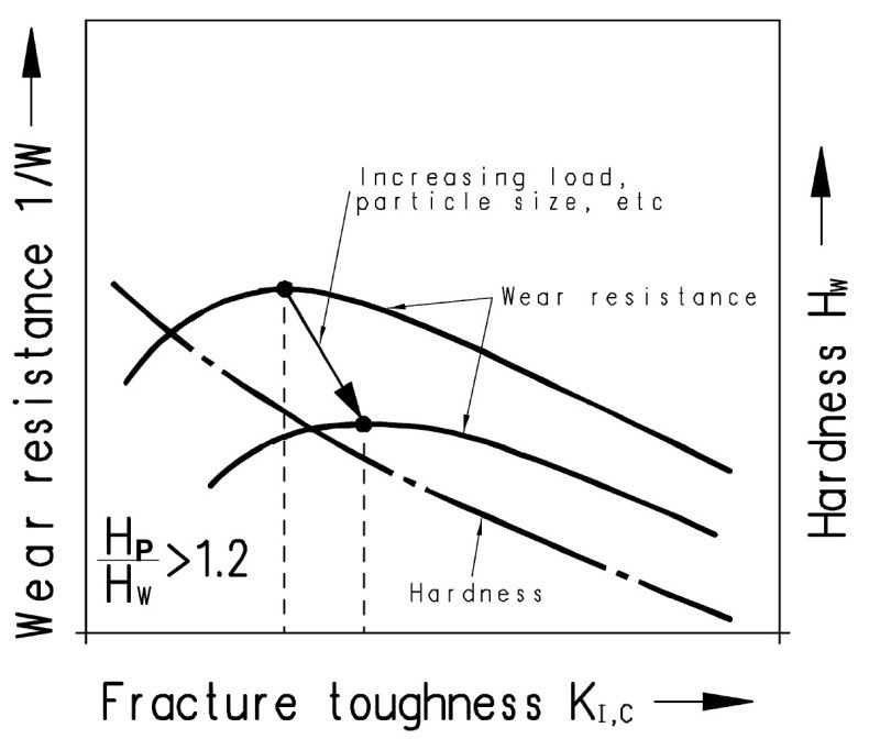Nimmt neben der Härte HW des Grundkörpers auch dessen Bruchzähigkeit KIc Einfluss auf die Höhe des Verschleißes, vgl. Gln. (10, 13), dann ist zu berücksichtigen, dass Härte HW und Bruchzähigkeit KIc sich umgekehrt proportional zueinander verhalten: Mit zunehmendem HW nimmt KIc ab. Die sich hieraus ergebenden Zusammenhänge sind in dem aus Messungen generierten Bild 22 dargestellt [15, 24]. Der Verschleißwiderstand (1/W) steigt mit wachsender Bruchzähigkeit KIc zunächst an, um nach Überschreiten eines ­Maximalwerts bei weiterer KIc-Steigerung wieder abzufallen. Ursache hierfür ist die in gleicher Richtung kontinuierlich abnehmende Härte HW. Es existiert somit eine optimale (HW, KIc)-Kombination zur Maximierung des Verschleiß­widerstandes, die jedoch von der aktuellen Beanspruchungssituation abhängig ist. Dieser Sachverhalt gilt sowohl für Abrasiv- als auch Strahlverschleiß und wird durch Praxis­erfahrungen bestätigt.