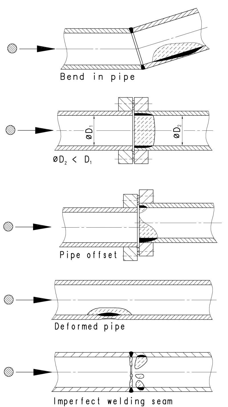 Vermeidung von Störstellen: Bild 23 zeigt Beispiele für Störstellen in pneumatischen Förderleitungen, die einen oft erheblichen lokalen Verschleiß verursachen. Auslöser sind ungewollte Ablenkungen der Partikelbahnen, Stoßkanten durch Grundkörperversatz usw. Vergleichbare Effekte werden auch bei abrasiver Beanspruchung beobachtet. Beispiele: Längsrillen parallel zur Gleitrichtung durch eine zu grobe Oberflächenbearbeitung des Grundkörpers oder durch Spalten bei Verlegung von Verschleißplatten können als Zwangsführungen für wandnahe Partikeln wirken. Diese Teilchen legen sich mit ihren verschleißerzeugenden Kanten in die vorgegebenen Furchen und vertiefen diese weiter. Querschnittsverengungen in Gleitrichtung resultieren in erhöhter Wandpressung usw.