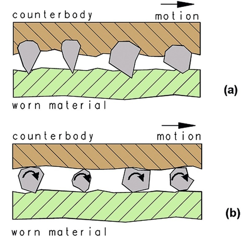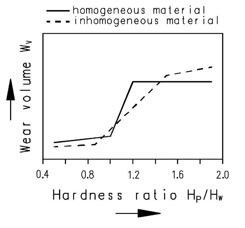 –   Kontaktgröße >> Durchmesser Härteträgerpartikel: Verbundwerkstoff verhält sich wie ein harter homogener Werkstoff. Das Verhältnis der Härte der Feststoffpartikeln HP zu derjenigen der Härteträgerteilchen HW,HT sowie die Bruchzähigkeit des Verbundwerkstoffs bestimmen die Größe des Verschleißes.