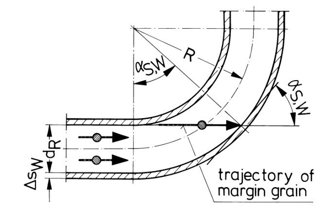 Im 90 °-Bogen kommt es bei dem vorliegenden Schüttgut zur Entmischung von Gas und Feststoff. Das Schüttgut bildet eine Strähne an der Krümmeraussenwand. Da diese sich erst hinter der Umlenkung wieder auflöst, verursacht das im anschließenden Rohr abrasiven Wandverschleiß. Ein der Umlenkung folgendes Rohrstück der Länge L90° ù 10  ·  dR muss deshalb ebenfalls verschleißfest ausgeführt werden. Bei grobkörnigen Schüttgütern ist diese Maßnahme, u.  a. auf Grund verstärkten Partikelrückpralls, ebenfalls notwendig.