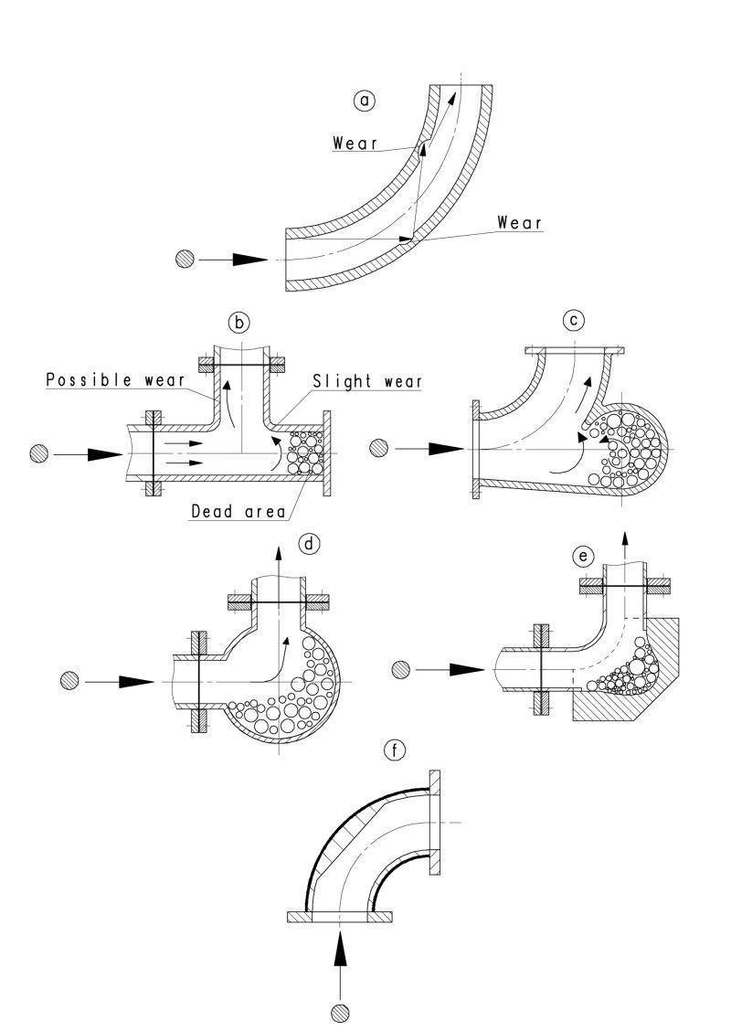 – Autogener Verschleißschutz: In Bild 26b-e sind Ausführungsvarianten des Prinzips „Schüttgut schützt vor Schüttgut“ am Beispiel von 90 °-Umlenkungen in einer pneumatischen Förderstrecke dargestellt. Es wird eine puffernde Feststoffschicht zwischen der Rohrwand und dem aufprallenden Schüttgutstrom aufgebaut. Somit trifft Schüttgut auf Schüttgut, die Rohrwand wird geschützt [20].