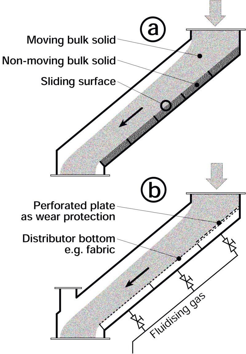 – Fluidisation: In einigen Anwendungsfällen ist eine drastische Verschleißreduzierung durch Fluidisation des (feinkörnigen) Schüttguts möglich. Hierzu muss die beanspruchte Wand als gasdurchlässiger Fluidisierboden, z.  B. mittels eines aufgelegten, ggf. metallischen, Gewebes, ausgebildet werden. Bild 24b verdeutlicht die Ausführung. Das Schüttgut „schwebt“ quasi über der Wand. Die Lebensdauer derartiger Gewebeböden liegt im Bereich mehrerer Jahre.