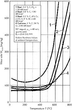 Bild 14 zeigt beispielhaft die Temperaturabhängigkeit des ­Verschleißes verschiedener Stahl-/Gusseisenwerkstoffe bei Beschuss mit Quarzsand: Partikeldurchmesser DP = (0,4 – 0,6) mm, Anstrahlwinkel aS,W = 90 °, Aufprallgeschwindigkeit uP,0 = 48 m/s [7]. Bis ca. (400 – 450)°C sind nur unwesentliche Veränderungen zu beobachten, beim Normalstahl, Kurve 1, sogar eine geringe Verschleißabnahme. Im Temperaturbereich T < 450 °C wirken die sich bildenden Eisen­oxidschichten, die eine größere Härte als der Grundwerkstoff aufweisen und deren Dicke mit der Temperatur anwächst, als Verschleißschutz. Bei höheren Temperaturen sind diese Schichten über ihre Dicke unterschiedlich aufoxidiert und ihre Bindung an den Grundwerkstoff wird schwächer. Sie werden durch den Partikelbeschuss leicht abgelöst = Verschleißabtrag, bilden sich relativ schnell wieder neu, werden wieder abgetragen usw.