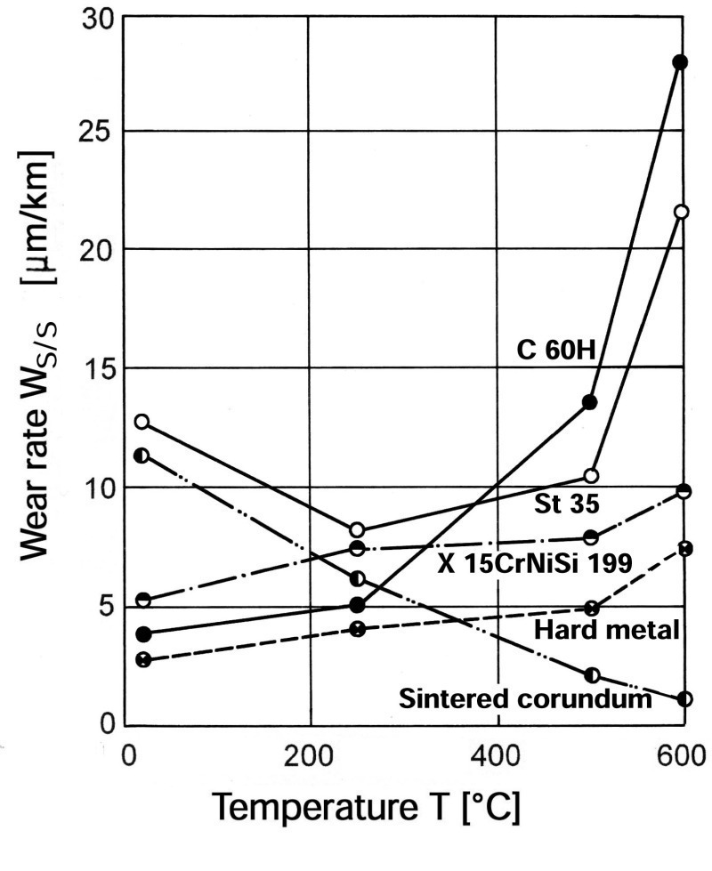 – Betriebstemperatur TB: Steigende Arbeitstemperatur führt nicht zwangsläufig zu größerem Verschleiß. Das zu erwartende Verhalten kann jedoch nicht durch einfache Extrapolation der Temperaturabhängigkeiten f (T) der relevanten Werkstoffkennwerte auf die Betriebstemperatur ermittelt werden. Je nach Art des Wandwerkstoffs führen höhere ­