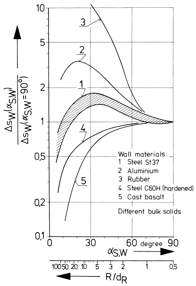 ordnet, die durch ihr Verhältnis Radius/Rohrdurchmesser R/dR gekennzeichnet sind. Die unterschiedlichen Wandwerkstoffe weisen Verschleißmaxima in verschiedenen Winkelbereichen auf. Es kann grob in folgende Klassen eingeteilt werden: