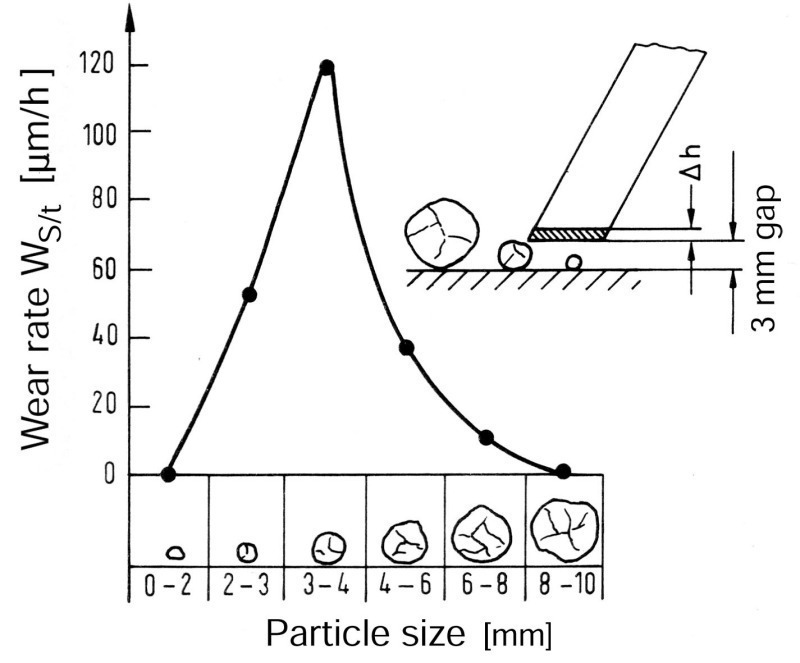 Bei Beanspruchung durch Schüttgut wird das Verschleißverhalten vom Verhältnis des Durchmessers der Härteträgerteilchen zur Größe des von den Schüttgutpartikeln verursachten Wandkontakts, z.B. Tiefe und Breite einer Furche bei Abrasivverschleiß, bestimmt. Näherung: Kontaktgröße ~ Schüttgutpartikelgröße. Es gilt nach Bild 11 (Teil 1):