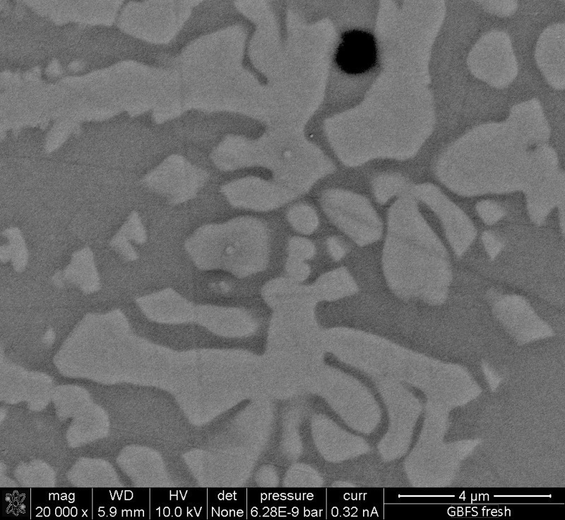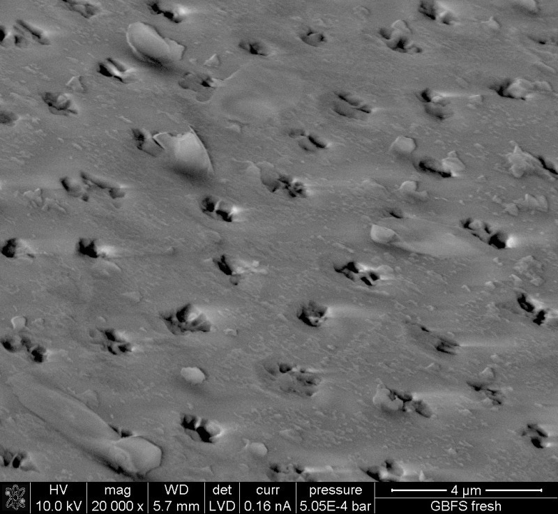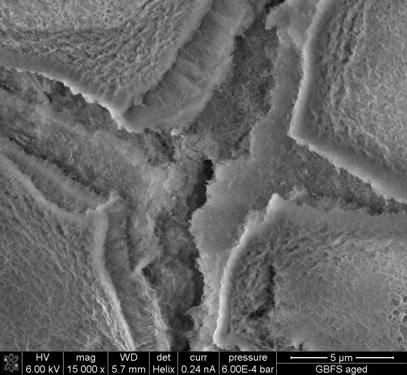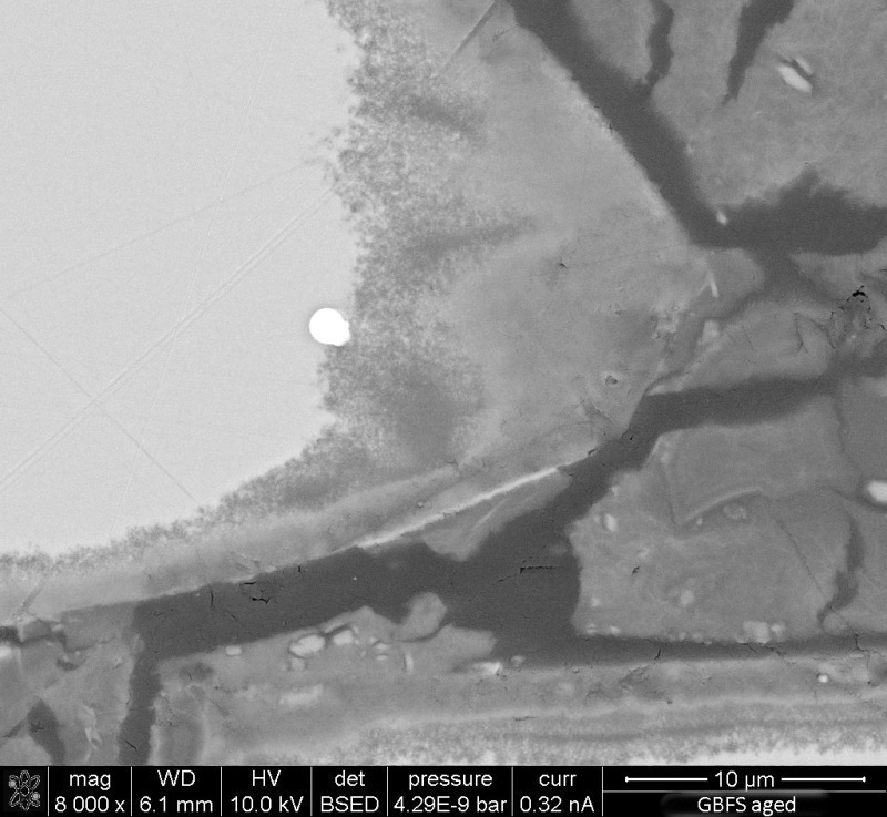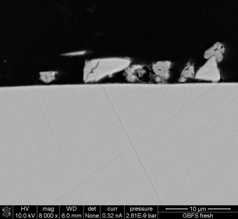 Der mittels Röntgenbeugung ermittelte Glasgehalt liegt nahe 100  %. Ein geringer Calcitgehalt ist am abgelagerten Material detektierbar. Weitere Phasen verhalten sich röntgenamorph bzw. liegen unterhalb der Nachweisgrenze. Einen präzisen Eindruck der Oberflächentextur geben hochauflösende Aufnahmen mittels Rasterelektronenmikroskopie wieder. Beide Hüttensande besitzen eine hohe Porigkeit (vgl. Bild 4) der Glasmatrix. Die bei der Granulation entstehenden Poren treten in variablen Durchmessern von wenigen µm bis zu 300 µm auf. Sie sind unregelmäßig verteilt. Reaktionsprodukte im Inneren der Poren lassen darauf schließen, dass sie im ungemahlenen Zustand mit einer wässrigen Lösung gefüllt sind. Die Oberfläche des frischen Hüttensandes ist nur sehr gering mit Produkten belegt, welche eine abbildbare Größe aufweisen. Kleinere Agglomerate sind flächig verteilt. Am Anschliff konnte neben der Hauptmatrix eine weitere, aluminium- und schwefelfreie Phase identifiziert werden (Bild 1, heller Bereich). Der geringe Eisengehalt des Hüttensandes konzentriert sich in Form von lokalen, tröpchenförmigen Einschlüssen (Bild 2), welche eine geringe Oxidationsstufe beinhalten. Eine flächige Belegung der frischen Hüttensandoberfläche (Bilder 3 und 4) mit Halit-