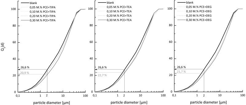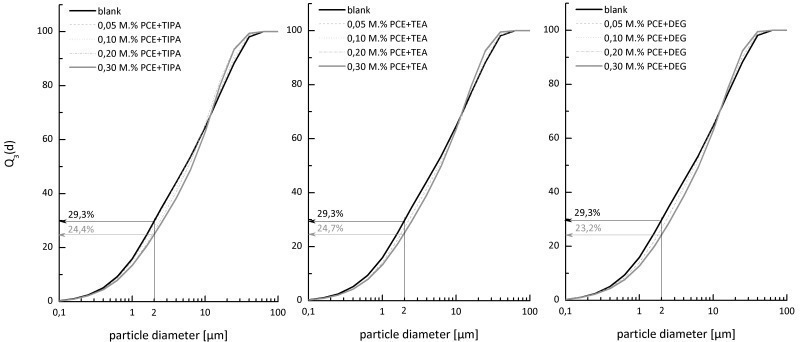4.2 Wirkung der Mahlhilfen auf die Korngrößenverteilung bei konstantem BLAINE-Wert