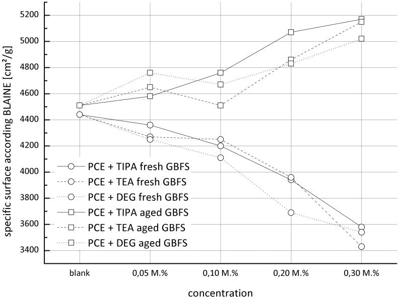 Frischer und abgelagerter Hüttensand zeigen nach 210  min Mahlung einen nahezu identischen BLAINE-Wert von bereits 4500  cm²/g. Die Applikation der Mahlhilfen bewirkt bei ­einer konstanten Mahldauer einen gegensätzlichen Effekt