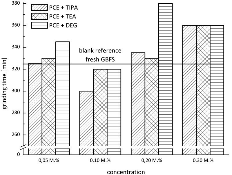 (Bild 9). Während am abgelagerten Hüttensand der BLAINE-Wert deutlich gesteigert wird, zeigen Messungen am frischen Hüttensand eine Reduzierung der spezifischen Oberfläche. Die weitere Mahlung bis zum Zielwert zeigt zudem den Einfluss der Dosiermenge auf die Mahldauer. Frischer Hüttensand zeigt nur bei sehr geringer Zugabe von Mahlhilfe 1 (PCE+TIPA) eine verkürzte Mahldauer. Andere Wirkstoffe und insbesondere höhere Konzentrationen (>  0,10  %) bewirken eine Verlängerung des Mahlprozesses. Deutliche Energieeinsparungen können jedoch am abgelagerten Material erzielt werden. Auch hier wurden mit der Kombination PCE+TIPA die kürzeste Mahldauer erzielt. Im Gegensatz zum frischen Hüttensand sind jedoch alle Mahlhilfen im Hinblick auf den Zielwert von 5500 cm2/g wirksam. Konzentrationen >  0,10 M.% führen dabei zu sehr deutlichen Zeiteinsparungen.