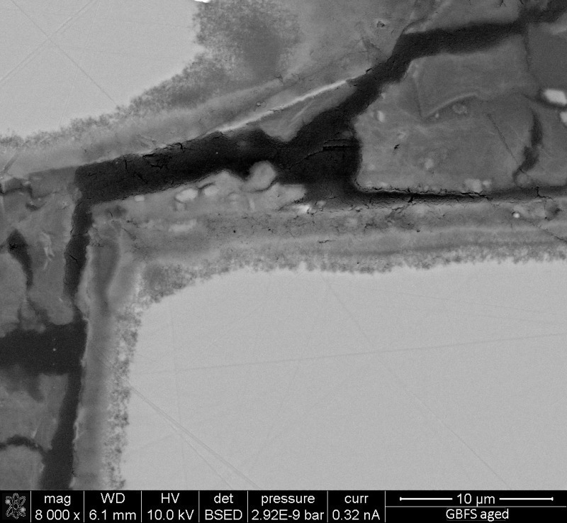 Kristallen ist ebenfalls auf den Granulationsprozess zurückzuführen. In dessen Wasserkreislauf reichern sich Alkalichloride (NaCl oder KCl) an, welche mit der Restfeuchte des Materials aus dem Kreislauf ausgetragen werden. Bei der Probenpräparation, aber auch bei der Trocknung der Restfeuchte vor der großtechnischen Mahlung in Kugelmühlen, kristallisieren die Halit- bzw. Sylvinkristalle auf der Oberfläche aus. Man findet sie daher stets als äußerste Schicht. Auch am abgelagerten Hüttensand (Bilder 5 und 6) wurde Halit – in geringeren Mengen – als Belegung auf den C-S-H-Phasen nachgewiesen. Die erste Interaktion eines Mahlhilfsmittels nach dessen Dosierung erfolgt somit mit einem Film aus Alkalichloriden. Während sich am frischen Hüttensand die Glasmatrix anschließt (Gelschichten und Auslaugungszone der Korrosion ausgenommen), bilden am abgelagerten Material eine Reihe von Reaktionsschichten eine Barriere zum Bulk-Glas. Ausgehend von der homogenen Glasmatrix geht das Gefüge in einen Auflösungsbereich über, welcher vor allem an Calcium und Magnesium verarmt ist. Hieran schließt sich die innere Reaktionsschicht an, welche als C-S-A-M-H-Phase beschrieben werden kann. Literaturquellen geben diesen Bereich auch als Hydrotalcit-ähnliche Schicht an. Auf dieser Schicht bilden C-S-H-Phasen eine abschließende Grenzschicht nach außen. Nach nur 6-monatiger Lagerung