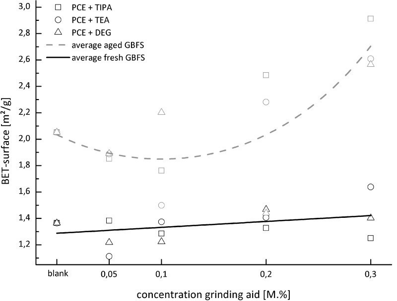 Die BET-Oberfläche als Maß der Mikrorauigkeit wird maßgebend vom Anteil der Feinstpartikel beeinflusst. Hierzu tragen die Korngrößenverteilung und der Gehalt an Feinstpartikeln bei. Frische Hüttensande zeigen üblicherweise BET-Werte von 1,0 m²/g bis 1,5 m²/g. Bei abgelagerten Hüttensanden beeinflusst die Zerstörung der Hydratationsschicht ebenso wie bei der Bestimmung des BLAINE-Wertes die Messung der BET-Oberfläche. Hierbei werden meist Oberflächen von mehr als 2,0 m²/g bestimmt. In Abhängigkeit der Dosiermenge wirken die verwendeten Mahlhilfen auf den BET-Wert ein, in dem sie die Verteilung der Feinstfragmente der Hydratationsschichten beeinflussen. Insbesondere höhere Dosiermengen führen zu erhöhten BET-Oberflächen (Bild 12), ohne dass ein Einfluss des Wirkstoffes erkennbar ist.