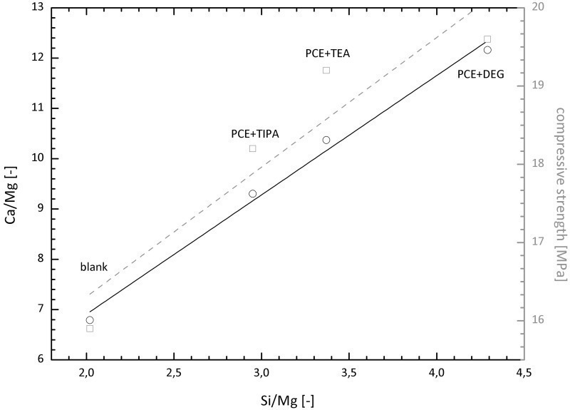 Die Bestimmung der Auflösungsrate gibt an, welche Stoffmenge pro Zeit unter definierten Bedingungen in Lösung geht. Die angewandte Methode ist detailliert in [2] beschrieben. Die in Tabelle 4 aufgeführten Auflösungsraten stellen einen Mittelwert aus 7 Einzelmessungen dar, welche einen Zeitraum von 0 bis ca. 10 Minuten abdecken. Der Einfluss der Mahlhilfen auf die Auflösungsrate korreliert mit den Ergebnissen zur Entwicklung Umsatzgrades. Auch hier kann nur beim frischen Hüttensand ein direkter Einfluss abgeleitet werden Der teils negative Einfluss des DEG auf die Normdruckfestigkeiten spiegelt sich an dieser Stelle in einem gehemmten Auflösen des Hüttensandes wider. Analysen der Eluate zeigen, dass die einzelnen Wirkstoffe der Mahlhilfen individuell auf einzelne Elemente wirken (Bilder 15 und 16). Inwiefern es sich hier um eine verbesserte Löslichkeit oder aber um eine beeinflusste Phasenbildung handelt bleibt vorerst offen. Die Ergebnisse zeigen, dass eine direkte Wechselwirkung zwischen Mahlhilfe und Hüttensandglas stattfindet. Sie ist an der unbelegten Oberfläche (frischer Hüttensand) deutlich ausgeprägter als an den Fragmenten früherer Reaktionsprodukte. Diese Wechselwirkung findet nicht mit allen Elementen des Hüttensandes in gleichem Umfang statt. Obwohl TIPA und TEA bevorzugt dreiwertige Ionen komplexieren, sind es hier das Ca2+ sowie das Mg2+, die deutlich in ihrer Konzentration verschoben werden. Die Al3+-Konzentration bleibt im Vergleich dazu stabil. Trotz dass die Bestimmung der Lösungsrate in ihrem Versuchsaufbau nicht exakt den Bedingungen im Bindemittel (hier CEM III/A) entspricht, lässt sich die Wirkung der Mahlhilfen auf die Normdruckfestigkeit mit der veränderten Auflösung in Bezug setzen.