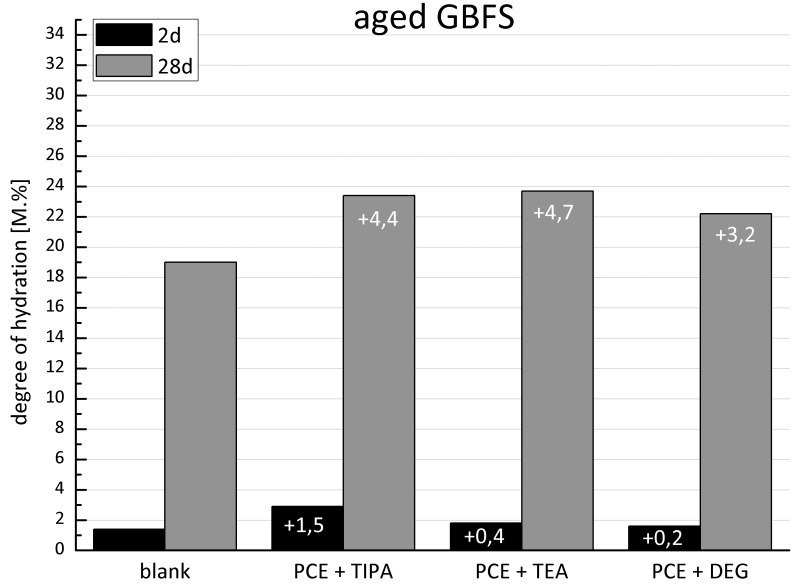 Die Bestimmung der Normdruckfestigkeit klärt nicht die Frage, ob deren Anstieg auf eine veränderte Reaktion des Zementklinkers oder eine beschleunigte Reaktion des Hüttensandes selbst zurückzuführen ist. Ein physikalischer Effekt kann nach 4.2 und 4.3 nicht auf einer Erhöhung des Feinstanteils sondern lediglich auf eine Erhöhung der Packungsdichte beruhen. Eine orientierende Auskunft hierüber gibt die Bestimmung des Umsatzgrades mit einem selektiven Lösungsverfahren. Die ­Bilder 13 und 14 zeigen den zeitbezogenen Umsatz am Beispiel der Konzentrationen, welche nach 2 Tagen den höchsten Festigkeitszuwachs am Normmörtel aufwies. Der deutliche Gegensatz zwischen frischem und abgelagertem Material belegt den Reaktivitätsverlust durch die Haldenlagerung. Die ermittelten Unterschiede sind vor allem am Zement mit frischem Hüttensand ausgeprägt und liegen in einem statistisch sicheren Bereich. Die Änderung des Umsatzgrades nach 2 d am abgelagerten Hüttensand ist messbar, bewegt sich allerdings zum Teil im Toleranzbereich des Verfahrens. Hinter dem geringen Anstieg der Probe des abgelagerten Materials, welches mit PCE+TEA gemahlen wurde, steht die Frage, inwiefern sich das adsorbierte Triethanolamin auf das Verfahren, speziell auf den spezifischen Lösungsrückstand des Ausgangsmaterials auswirkt. Triethanolamin ist Bestandteil des komplexbildenden Lösungsmittels, in welchem die hydratisierten Proben selektiert werden. Eine Korrelation mit den bestimmten Normdruckfestigkeiten ergibt sich nur tendenziell und hier bevorzugt am frischen Hüttensand. Hierfür gibt es zwei relevante Gründe. Zum einen bietet das verwendete Verfahren trotz sorgfältiger Anwendung eine begrenzte Genauigkeit. Zum zweiten steht neben der Reaktion Mahlhilfe – Hüttensand parallel die Reaktion Mahlhilfe – Klinkerphase im Vordergrund.