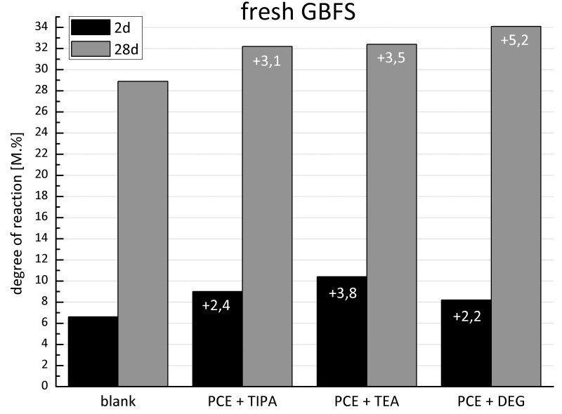 Die hergestellten Laborzemente entsprechen in ihrer Zusammensetzung einem CEM III/A. Tabelle 3 ist zu entnehmen, dass die Frühfestigkeit nach 2 Tagen bei beiden Hüttensanden in Richtung einer schnelleren Festigkeitsentwicklung verschoben werden kann. Bei der Mahlung konnten keine signifikanten Unterschiede der einzelnen Wirkstoffe in ­Bezug auf den Mahlprozess erkannt werden. Für die Wirkstoffe PCE+TIPA sowie PCE+TEA trifft dies auch auf die Auswirkungen auf die Druckfestigkeit des Normmörtels zu. Die Kombination PCE+DEG wirkt allerdings sehr differenziert auf die verschiedenen Hüttensande. Der Tabelle ist zu entnehmen, dass am Zement, welcher mit frischem Hüttensand hergestellt wurde, mit PCE+DEG die absolut höchste Druckfestigkeit nach 2 d (ein Zuwachs von 23  %) bestimmt wurde. Die gleiche Wirkstoffkombination bewirkt in unveränderter Konzentration am abgelagerten Material lediglich einen Anstieg von nur 4  %. Es kann hier bei einer Überdosierung sogar zu geringeren