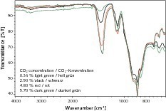 Die Analyse des Kalksteingehaltes von CEM II-Zementen wird üblicherweise nach DIN EN 196-2 oder röntgenographisch durchgeführt. Nahezu unbekannt ist, dass sich auch die FT-IR-Spektroskopie als schnelle Methode zur quantitativen Analyse des CaCO3-Gehaltes in Zement eignet. Dazu eigenen sich insbesondere die Banden bei 877 und 1420 cm-1 (v2 und v3). Mit zunehmendem CaCO3-, also zunehmendem CO2-Gehalt, nimmt die Intensität der entsprechenden Banden zu (Bild 9). Die aus den Daten erhaltene Kalibrationskurve ist in Bild 10 dargestellt. Dort ist der FT-IR-spektroskopisch erhaltene CO2-Gehalt dem Normverfahren (DIN EN 196-2) gegenübergestellt. Trotz des eigentlich sehr guten Korrelationskoeffizienten sind die Messergebnisse von Proben mit einer geringen spezifischen Oberfläche nach Blaine unbefriedigend. Größter Einfluss auf die Qualität der Spektren hat die Partikelgröße. Die räumlichen Dimensionen der einzelnen absorbierenden Partikel haben einen wesentlichen Einfluss auf die Spektren. Sind die Partikelgrößen deutlich kleiner als die Wellenlänge der einfallenden IR-Strahlung, treten nur sehr schwache Störungen im Spektrum auf. Mit zunehmender Partikelgröße nehmen die Strahlungsverluste durch Streuung zu und die Basislinie fällt im Spektrum von niedrigen nach höheren Wellenlängen ab. Bei Partikel mit sehr großem Durchmesser erfolgt eine vollständige Absorption der IR-Strahlung bereits in den äußeren Schichten der Partikel. Die inneren Schichten tragen dann nicht mehr zur Gesamtabsorption aller Partikel bei. Durch Feinstmahlung der Proben werden die Partikelgrößeneffekte drastisch vermindert. Bei Materialien, die leicht „verschmieren“, wie z.  B. Gips oder Tone, sind die Korngrößeneffekte deutlich geringer. Hier liegen die Messergebnisse innerhalb der geforderten Toleranzen [4].