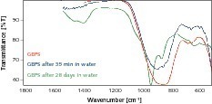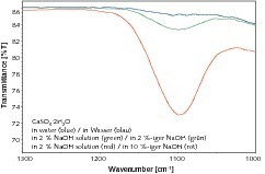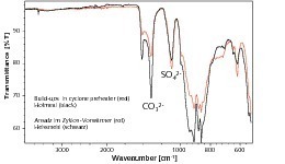 Ein Beispiel für die Untersuchung einer ex-situ Reaktion ist die Hydratation von Hüttensand. Dazu wurde Hüttensand in Wasser dispergiert und ein Teil des Materials nach bestimmten Zeiten entnommen, getrocknet und mittels ATR-Zelle vermessen. Die FT-IR-Spektren zeigen deutliche Änderungen im Bereich der Gitterschwingungen der verschiedenen mineralogischen Bestandteile des Hüttensandes (Bereich 1100 – 800 cm-1). Ebenso wird die zunehmende Carbonatisierung der Probe anhand der zunehmenden Intensität der v3-Bande der Carbonatschwingung bei ca. 1420 cm-1 deutlich. Die zeitabhängige Änderung der Bandenintensitäten lässt sich auch dazu nutzen Reaktionsgeschwindigkeiten zu berechnen. Darauf soll in diesem Rahmen jedoch nicht eingegangen werden.