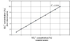 Eine mögliche Anwendung im Bereich mineralischer Bindemittel ist die schnelle Analyse des wasserlöslichen Sulfatgehaltes von Zement, der für das Abbindeverhalten maßgeblich ist. Die Löslichkeit des Sulfatträgers (Anhydrit, Halbhydrat, Dihydrat) hängt stark vom pH-Wert ab (Bild 7). Im Bereich der Streckschwingungsbanden der Sulfatmoleküle (1100 cm-1) wird ersichtlich, dass die Konzentration, d.  h. die Löslichkeit des Sulfatträgers, mit größer werdendem pH-Wert erheblich zunimmt. Die Sulfatkonzentration der verschiedenen Lösungen lässt sich mit Hilfe einer Kalibrationskurve quantifizieren (Bild 8). Für die löslichen Sulfatgehalte zeigte sich, dass die errechneten FT-IR-Werte in der Kalibration mit hoher Genauigkeit innerhalb der geforderten Toleranzgrenzen liegen.