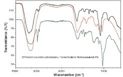 Weitere qualitative Anwendungen liegen in der Qualitätssicherung. Die ATR-Technik eignet sich als schnelle Methode für die Eingangskontrolle von z.  B. Betonzusatzmitteln (Bild 3) oder auch Mahlhilfen, die für die Zement- oder Gipsmahlung verwenden werden. Durch Hinterlegung von Spektren in einer entsprechenden Datenbank kann auch hier innerhalb kürzester Zeit ein Identitätsabgleich erfolgen.