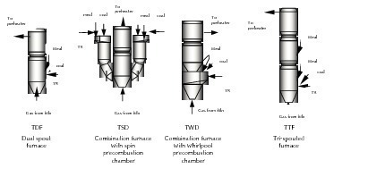 Unter Berücksichtigung der Korrelation zwischen den Kenndaten der Verbrennung von Kohlenstaub und Anlagen zur Vorkalzinierung hat das TCDRI (Konstruktions- und Forschungsinstitut der Zementindustrie in Tianjin) unterschiedliche Typen von Kalzinatoren [10] für den Einsatz unterschiedlicher Brennstoffe entwickelt (Bild 2). Alle diese Kalzinatoren basieren auf dem Kalzinator mit Doppelrohrfeuerung (TDF) vom TCDRI. Um die Zuverlässigkeit und Anpassungsfähigkeit des Kalzinators zu garantieren, wurden die folgenden drei Typen von Kalzinatoren entwickelt. Der Kalzinator mit der Bezeichnung TSD stellt eine Kombination aus dem TDF und einer Vorbrennkammer mit innerem Drehimpuls dar. Der Kalzinator TWD ist eine Kombination aus TDF und einer Wirbelvorbrennkammer. Der Kalzinator TTF ist eine Feuerungsanlage mit drei Rohren für hohe Temperaturbereiche.