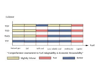 Wenn man die o.a. Ergebnisse zusammenfasst, so ergibt sich, dass die Temperaturverteilung in dem Kalzinator TDF mit Doppelrohrfeuerung relativ gleichmäßig verläuft bei einer Grundarbeitstemperatur von ca. 900 °C und keiner Zone hoher Temperaturen. Der Kalzinator TDF ist geeignet für das Verbrennen von Brennstoffen mit guten Verbrennungskennwerten. Dazu gehört auch die gasreiche bituminöse Kohle. Der TDF ist nicht geeignet für Brennstoffe, die sich schwer verbrennen lassen. Dazu gehören die gasarme bituminöse Kohle, Anthrazit oder auch Petrolkoks. Die Kalzinatoren vom Typ TWD und TSD besitzen eine Vorverbrennungskammer für höhere Temperaturen. Die schwer zu verbrennenden Brennstoffe, einschließlich Anthrazit, können in der Vorbrennkammer vollständig verbrannt werden. Die Materialverteilung im Kalzinator TSD ist jedoch ziemlich ungleichmäßig. In diesem Kalzinator gibt es stellenweise Zonen hoher Temperatur, wodurch es während der Produktion leicht zur Bildung von Ansatz und Verstopfungen kommen kann. Die Temperatur im Kalzinator TWD ist niedriger und die Verweilzeit des Materials relativ länger. Daher ist dieser Kalzinator für das Verbrennen gasarmer bituminöser Kohle geeignet (Vad  <  15  %).