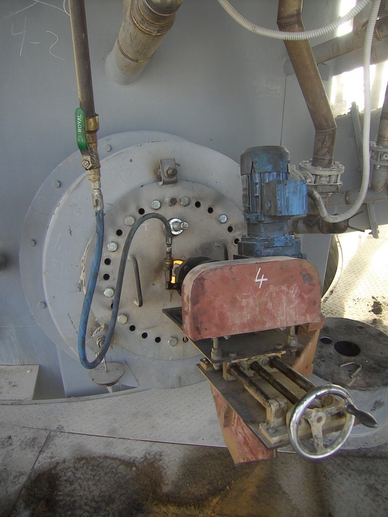 Parallel dazu sind zwei weitere Eberhardt Kalkschachtöfen Typ O 135 fertiggestellt worden und mittlerweile mit einer Leichtölfeuerung in Betrieb gegangen (Bild 2). Die bislang erreichten Betriebsdaten übertreffen die Erwartungen (Tabelle 1). Die hier gezeigten Betriebsdaten beider Fabriken beziehen sich auf einen Kalkstein mit 95  % CaCO3-Gehalt. Sobald die zentrale Versorgung mit Erdgas in dieser Fabrik gewährleistet ist, werden beide Öfen auf Erdgas umgestellt. Das notwendige Feuerungssystem ist bereits installiert. Bei einem Brennstoffwechsel von Öl auf Erdgas werden die Öl-Injektoren (Bild 3) in ihre seitliche Halterung an der Brennkammer geklappt und die Erdgas-Brennereinsätze mit ihrem Brennergehäuse eingeschoben . Der Hauptbrenner wird mittels eines Pilotbrenners gezündet, welcher danach der Flammenüberwachung dient. Nach diesem Wechsel kann nach und nach jede Brennkammer mit dem neuen Brennstoff in Betrieb gehen.