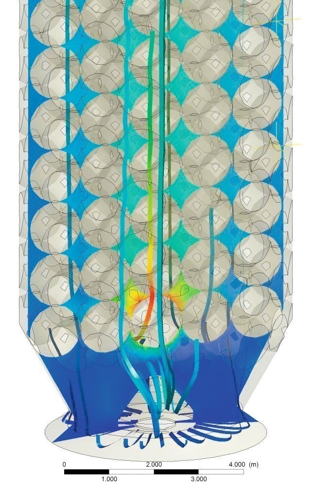 In der Praxis wird der Weg zu Innovationen durch jährliche Kundenbesuche und Inspektionen unserer Kalkbrennanlagen sowie durch den intensiven Erfahrungsaustausch über Kunden-Seminare, Schulungen und Workshops beschritten. Veranstaltet werden diese Events im M-Center, dem Kommunikations- und Schulungszentrum der M-Group in Lemgo (Bild 12). Für Forschung und Entwicklung wird die Nähe zur Hochschule Lemgo und dem Institut für angewandte Simulationstechnik und Forschungstransfer genutzt. Speziell die Strömungssimulation in Brennkammern [2] und Schüttungen sowie die Verbrennungssimulation von Kohlenstäuben im Eberhardt Kalkschachtofen sind Themen von bereits durchgeführten oder aktuellen Forschungsvorhaben (Bild 13)