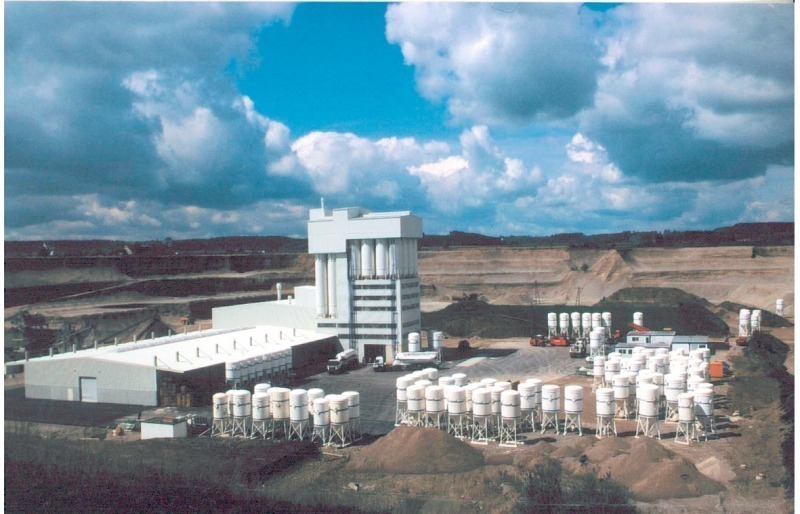 With mechanical conveying, the sands are split into fractions by an upstream screening machine on the top level. Depending on the number of major component silos, either one or two scales are usually fed in parallel from the silos by metering units (dosing screw conveyors and dosing slide valves). The components are passed gravimetrically on to the mixer, with additives and pigments added by special stationary additive dosing systems [2]. After the specified mixing time has elapsed, the mixer empties gravimetrically into the downstream packing process.