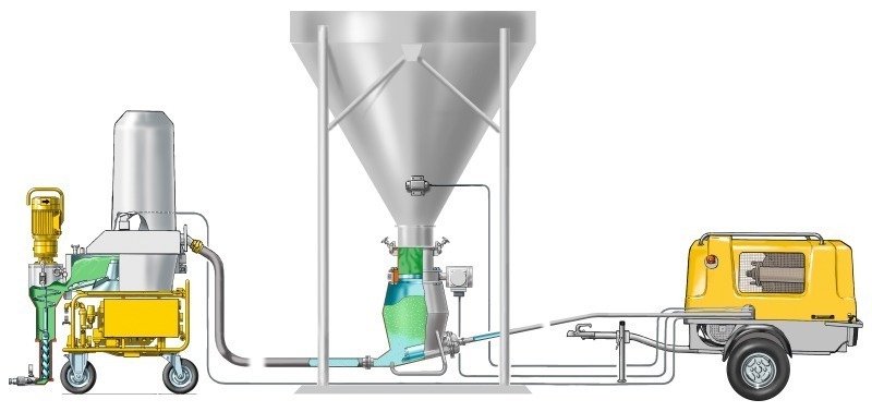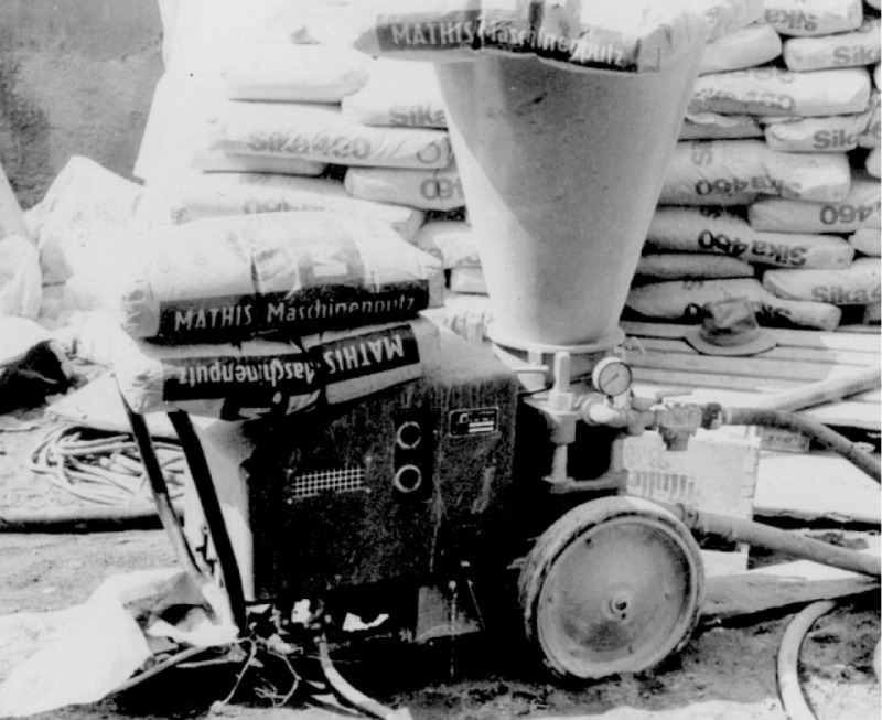 Um 1970 stellten Putzmeister (Bild 2) und pft eine Kombination aus Mischer und Pumpe vor, die eine einfache Beförderung über mehrere Stockwerke ermöglicht (besonders zum Einsatz bei Putzen und Estrichen). Diese Anlage wurde schnell auf die Handhabung von Schüttgütern angepasst. Die ersten kompletten Systeme wurden in den 1970er Jahren von m-tec entwickelt – eine Tochtergesellschaft von Mathis (Maxit, heute Teil von Saint Gobain Weber).