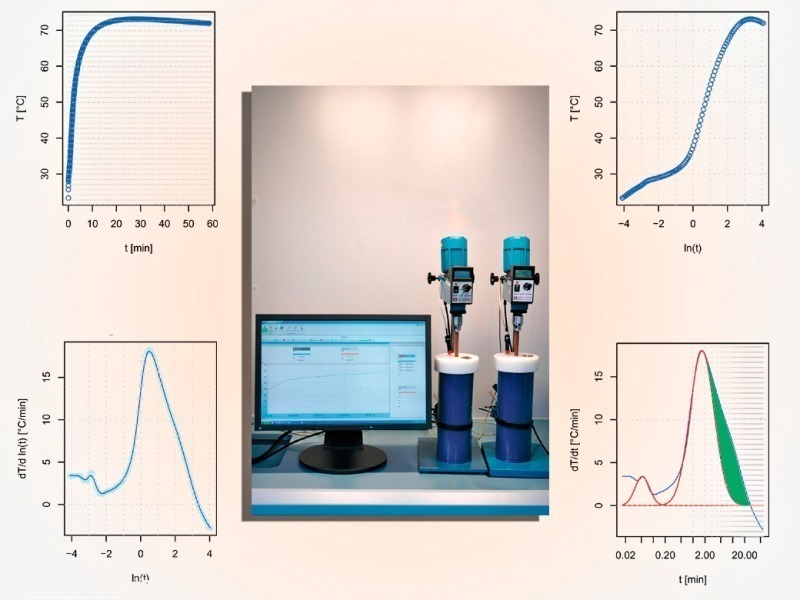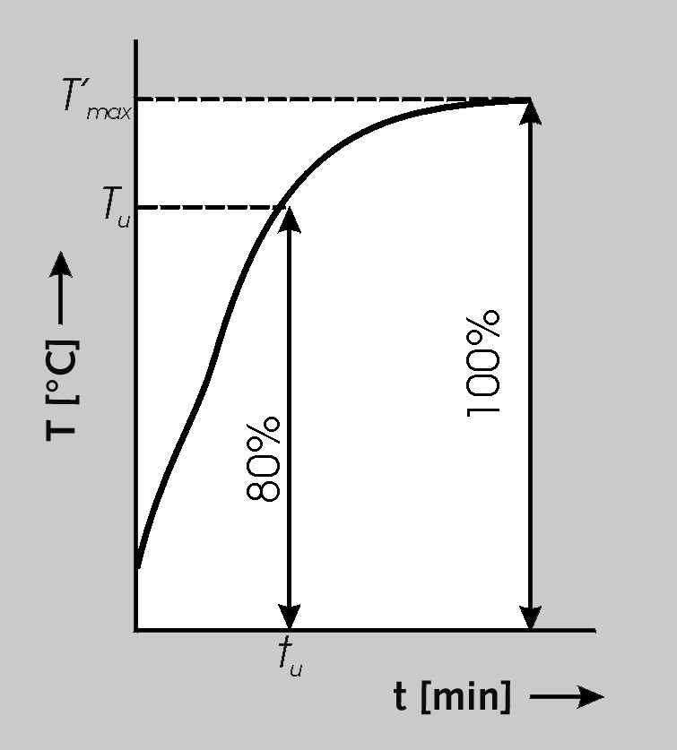 Die Bestimmung der Reaktivität erfolgt heutzutage in der Regel über die Aufzeichnung der Nasslöschkurve nach DIN EN 459-2 [1], welche aus der DIN 1060 [2] übernommen wurde. Hierbei wird in einer doppelwandigen Vakuum-Mantelflasche, dem sog. Dewar-Gefäß, (600 ± 1) g destilliertes Wasser mit (20 ± 0,5) °C vorgelegt und (150 ± 0,5) g Branntkalk zugegeben. Die Temperaturzunahme über die Zeit wird erfasst und der 80 %ige Umsatz des Kalkes – auf die Zeit tu [min] und die Temperatur Tu [°C] bezogen angegeben (Bild 1). Die gemessene Maximaltemperatur T’max [°C] wird unter Anwendung eines vorgegeben Wasserwertes korrigiert. Es wird somit weder die spezifische Wärmekapazität des Wasserkörpers betrachtet, noch der reale Wärmestrom, der von verschiedenen Faktoren wie z. B. Dauer der Messung, Energieeintrag durch den Rührer oder Temperaturgradient beeinflusst wird.