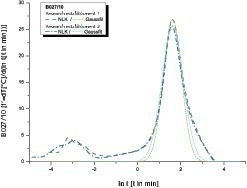 Die Kurvenverläufe der logarithmierten Ableitung weisen für alle untersuchten Proben ein initiales Maximum auf, an das sich bei langsameren Hydratationsverläufen ein weiteres Maximum anschließt. Das erste Maximum ist auf eine schnelle Calciumhydroxidbildung an der Branntkalkoberfläche zurückzuführen, die einen weiteren Wasserzutritt durch diese diffusionshemmende Schicht behindert. Diese Beobachtung führte zu der Hypothese, dass die Hauptreaktion einer logarithmierten Gauss‘schen Verteilungskurve entspricht.