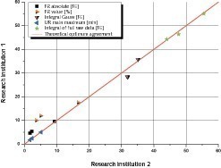 Um den Einfluss der Messapparatur bei der Ermittlung des FR-Wertes zu untersuchen, wurde in beiden Forschungsstellen an ausgewählten Proben mit der jeweils vorhandenen Messapparatur die Reaktivität gemessen und der FR-Wert ermittelt. Der Vergleich der ermittelten Parameter in Bild 9 zeigte dabei, dass sich für die absoluten und prozentualen FR-Werte Unterschiede in Abhängigkeit von der verwendeten Messapparatur ergeben können. Eine Gegenüberstellung der logarithmierten Ableitungen der Messdaten (Bild 10) weißt dagegen keine besonders signifikanten Unterschiede der Kurvenverläufe auf, wie sich auch durch die gut übereinstimmenden Werte für das vollständige Integral der abgeleiteten Kurve (‚Integral FullRohdaten‘) zeigt. Schon kleine Unterschiede in der Halbwertsbreite der ermittelten Kurvenverläufe haben demnach einen starken Einfluss auf die weitere Berechnung des FR-Wertes. Für direkte Vergleiche des FR-Wertes von Proben, die mit unterschiedlichen Apparaturen gemessen wurden, ist es daher zwingend notwendig, vorher vergleichende Messungen durchzuführen.