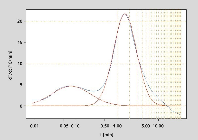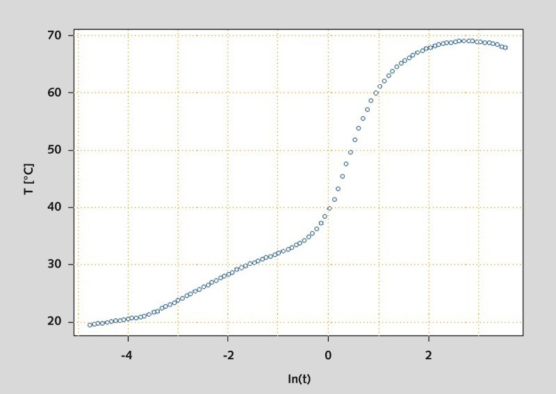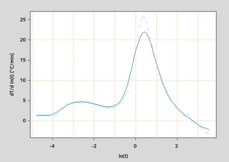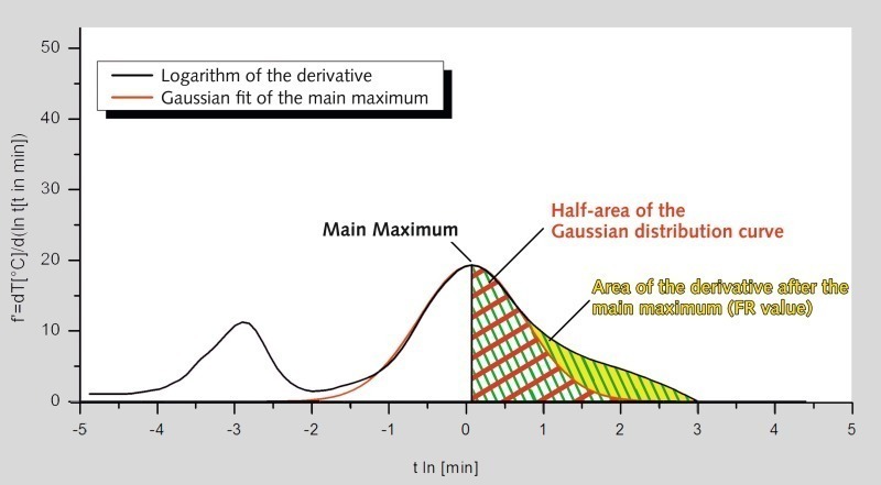 Die Ableitung der logarithmierten Nasslöschkurve erlaubt die Beschreibung der Branntkalkreaktivität über die Lage des Kurvenmaximums. Hierbei handelt es sich um den Zeitpunkt der höchsten Umsatzrate. Die Gesamtfläche unter der Kurve entspricht der freigesetzten Wärmemenge der Reaktion. Die erweiterte Auswertung lässt damit Rückschlüsse auf die Reaktionskinetik des jeweiligen Prozesses zu.