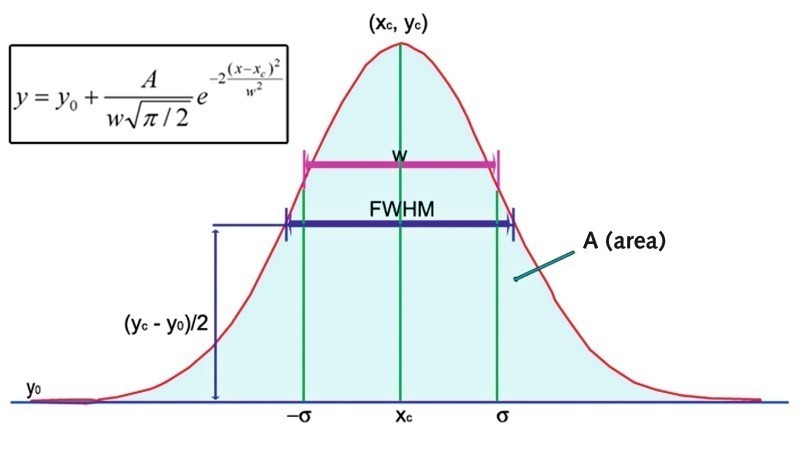 Mit bekannter Halbwertsbreite sowie gegebenem f(tmax) kann mit Hilfe der Gleichungen 11 und 12 die Gausskurve vollständig beschrieben werden.