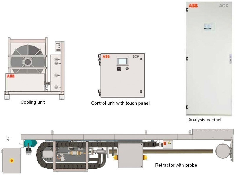 Für die Gasanalyse am Ausgang eines Drehrohrofens für trockene Zementherstellungsverfahren bietet ABB eine Kombination aus einem kompletten Analysenschrank und einem robusten, sicheren und umweltfreundlichen Probenentnahmesystem, das aus drei vormontierten Elementen besteht: einer Sondenfahrvorrichtung mit zwei unterschiedlichen wassergekühlten Sonden, einer Kühleinheit und einer industriellen Steuereinheit mit Touch Panel. Zur Beseitigung starker Verkrustungen am Messpunkt wurde eine neuartig aufgebaute Sonde mit mechanischem Stößel entwickelt. Dieses Element erhöht die Datenverfügbarkeit und reduziert gleichzeitig den Wartungsaufwand. Damit ermöglicht es dem Anlagenbetreiber eine optimierte Prozesssteuerung und trägt zu einer höheren Effizienz und Rentabilität des Werks bei.