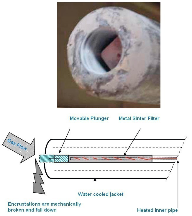 Die in der Primär- und der Sekundärfeuerung verwendeten Brennstoffe während der Zementherstellung beeinflussen die Prozessbedingungen am Gasausgang des Ofens. Durch die massive Verbrennung von Reifen, Petrolkoks und anderen Brennstoffen können starke Verkrustungen insbesondere an der Sondenspitze entstehen. In einigen Fällen reicht dann das Reinigen des Sondenrohrs und des Sondenfilter nicht mehr aus (Bild 3).