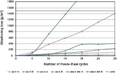 – MI-1 versagte ebenfalls sowohl hinsichtlich Frost-Tau-Angriff (CF) als auch beim Frost-Tausalz-Angriff (CDF)