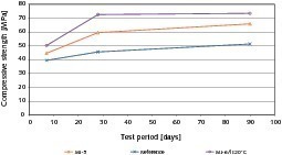 Der optimierte Geopolymer-Beton MI-6IS/20°C zeigt trotz fehlender Wärmebehandlung und trotz reduzierter Menge an primärer Aktivatorlösung (durch Austausch mit reaktivem Flüssigabfall) eine verbesserte technische Performance. Bereits der Geopolymer-Beton MI-5 erreichte Druckfestigkeitswerte von ca. 60 MPa nach 28 Tagen, während der Referenz-Zementbeton lediglich ca. 46 MPa aufweist [18]. Der Geopolymer-Beton MI-6IS übertrifft die Druckfestigkeit von MI-5 und erreicht schon nach 28 Tagen Werte > 70 MPa (Bild 6).