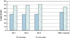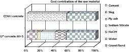 Ein Rohstoffkostenvergleich wurde für die Herstellung von Geopolymer-Beton und CEM I-Beton durchgeführt, unter der Annahme, dass ein Betonhersteller alle Rohstoffe extern einkaufen muss. Angefragt wurden die Preise für das Referenzjahr 2007 zu Konditionen eines Grossabnehmers in Deutschland. Die deutlichen Unterschiede zwischen den minimalen und maximalen Herstellungskosten von Betonen in Bild 1 ergeben sich aus den stark variierenden Angaben der Rohstoffkosten und Datenunsicherheiten (z.B. bei Hüttensanden).