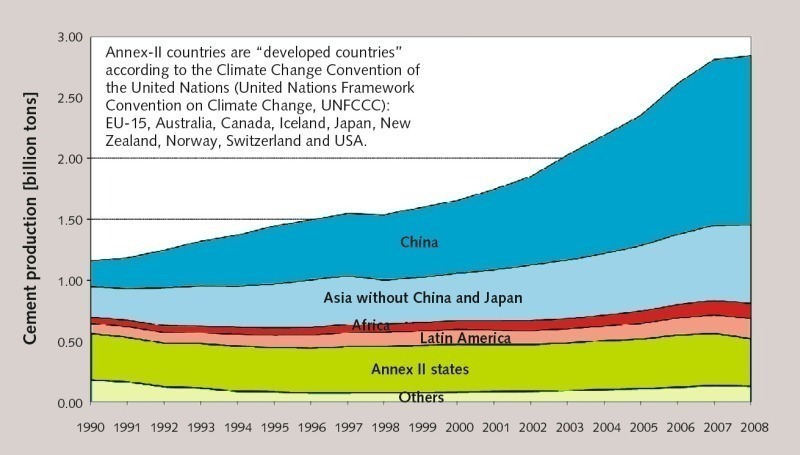 Die globale Zementindustrie wies in der letzten Dekade jährliche Zuwachsraten von ca. 7 % auf (Bild 2). Von 1,16 Mrd. t im Jahr 1990 wuchs die Zementproduktion bis 2008 weltweit auf rund 3 Mrd. t. Dieser Anstieg wurde insbesondere durch die stark wachsenden Märkte Asiens hervorgerufen. Schon 2003 kam ein Drittel der Weltproduktion aus China, 2008 waren es bereits 50 %. Auch wenn die Wirtschaftskrise 2008 zu einem konjunkturellen Einbruch in der Baubranche führte, hat sich die Zementproduktion insbesondere in Asien rasch wieder erholt. Bis 2013 wird ein jährliches Wachstum von 4,1 % vorhergesagt, womit die weltweite Zementproduktion bei 3,4 Mrd. t liegen dürfte.
