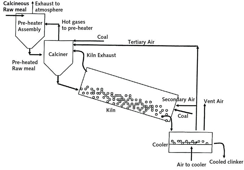 Drehrohröfen produzieren über den Wärmeprozess Klinker, der für die Herstellung von Portlandzement und anderen Arten von hydraulischem Zement eingesetzt wird. Dabei reagiert Kalziumkarbonat mit siliziumdioxidhaltigen Materialien, um eine Mischung von Kalziumsilikaten zu bilden. Jährlich werden mehr als 1 Mrd. t Zement hergestellt und Drehrohröfen sind das Kernstück in diesem Produktionsprozess. Ihre Kapazität wird im Allgemeinen von der Ofenkapazität begrenzt. Als wichtigster Energieverbraucher und Treibhausgasemittent ist es das Hauptanliegen der Zementindustrie, die Effizienz zu steigern (Blezard 1998). Bild 1 zeigt schematisch den Brennprozess in einem Zementwerk.