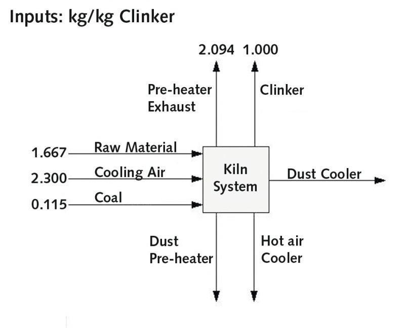 Bild 4 zeigt das Klinkerinputverhältnis von Rohmaterial, Kühlluft und Kohle in der Ofenanlage. Das Rückführungsverhältnis von Input und Output ist gleich. Die Eintragswerte des Rohmaterials in den Ofen des DCF, der Kühlluft und der Kohle betragen 1,667, 2,300 bzw. 0,115 kg/kg Klinker. Der durchschnittliche Eintragswert beträgt 4,082 kg/kg Klinker. Andererseits wird das Ausbeuteverhältnis in fünf Bereiche unterteilt. Der erste ist die Entlüftung des Vorwärmers (2,094 kg), der zweite ist der Klinker (1,00 kg), der dritte ist der Heißluftkühler (0,940 kg), der vierte ist der Staubvorwärmer (0,042 kg), und der fünfte ist der Staubkühler (0,006 kg). Dieser Durchschnitt ist auch beim Inputwert gleich (4,082 kg/kg Klinker). Eine große Menge von Klinker wird jedoch im Absaugteil des Vorwärmers genutzt. Nur 1,8 % Sauerstoff, 27,4 % CO2 und ein Maximum von 70,8 % Stickstoff werden in der Absaugung des Vorwärmers genutzt. Dieses System nennt man „Massebilanz des Ofens“.